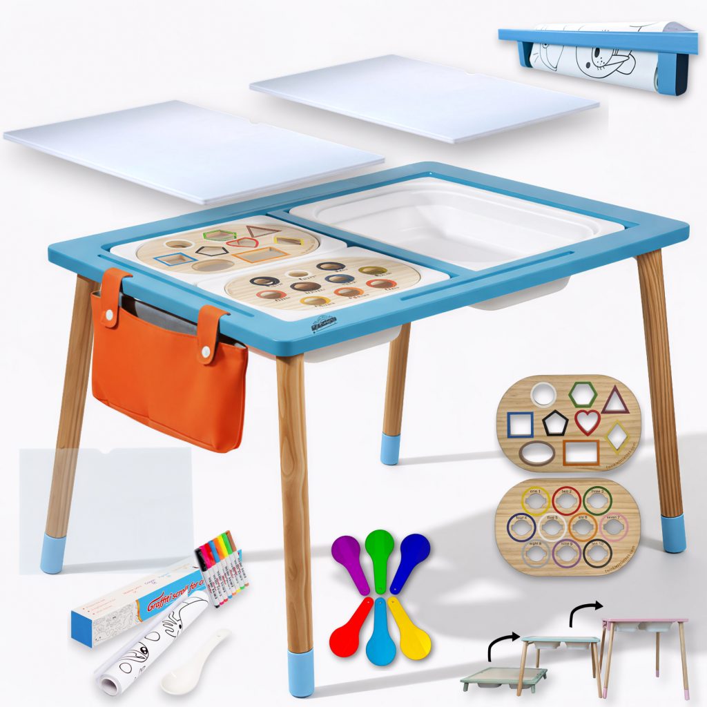 Meet our ST02 Sensory table for toddler in a vibrant Blue finish, designed to inspire hours of creative, hands-on play. It features 3 spacious bins, 2 White Acrylic Lids, 1 Transparent Lid, and color-matched leg extenders for adjustable height. The set includes 2 wooden inserts (SET2) for learning Color Sorter & Shapes, a built-in paper roll holder, 6 color paddles, 8 markers, 1 handy fabric storage bags, and a roll of adhesive coloring paper to spark imagination.