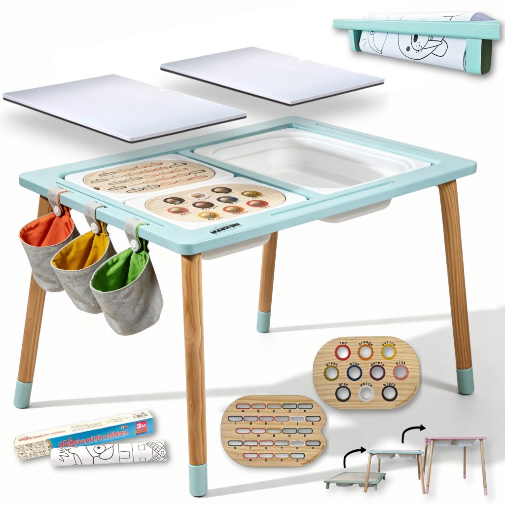 Meet our ST01 Sensory table for toddler in a vibrant Green finish, designed to inspire hours of creative, hands-on play. It features 3 spacious bins, 2 reversible plywood lids with a whiteboard on one side and a chalkboard on the other, and color-matched leg extenders for adjustable height. The set includes 2 wooden inserts (SET1) for learning colors and letters, a built-in paper roll holder, 3 handy fabric storage bags, and a roll of adhesive coloring paper to spark imagination.