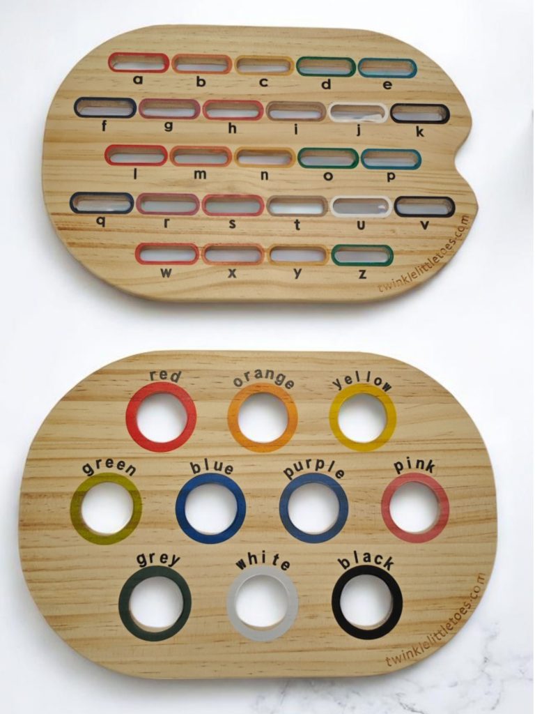 A color-sorting board that helps children develop fine motor skills, visual recognition, and early problem-solving abilities.